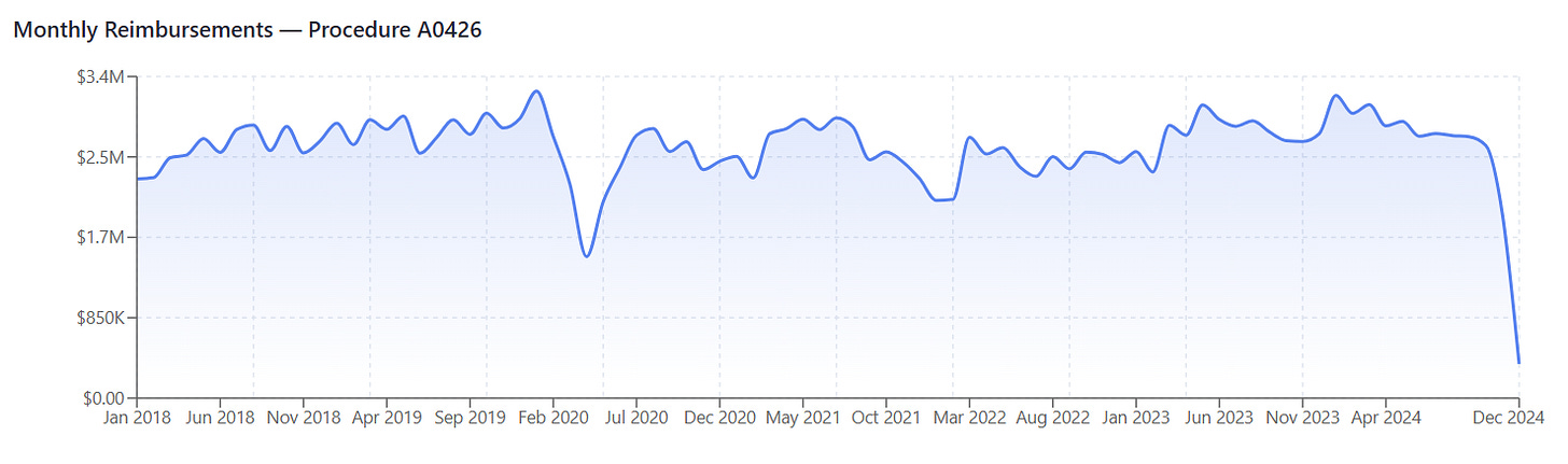 A0426 is ambulance transport non-emergency. This is the “control.” It’s flat. It shows rises we may detect are not due to more people in the system or systemic fraud.