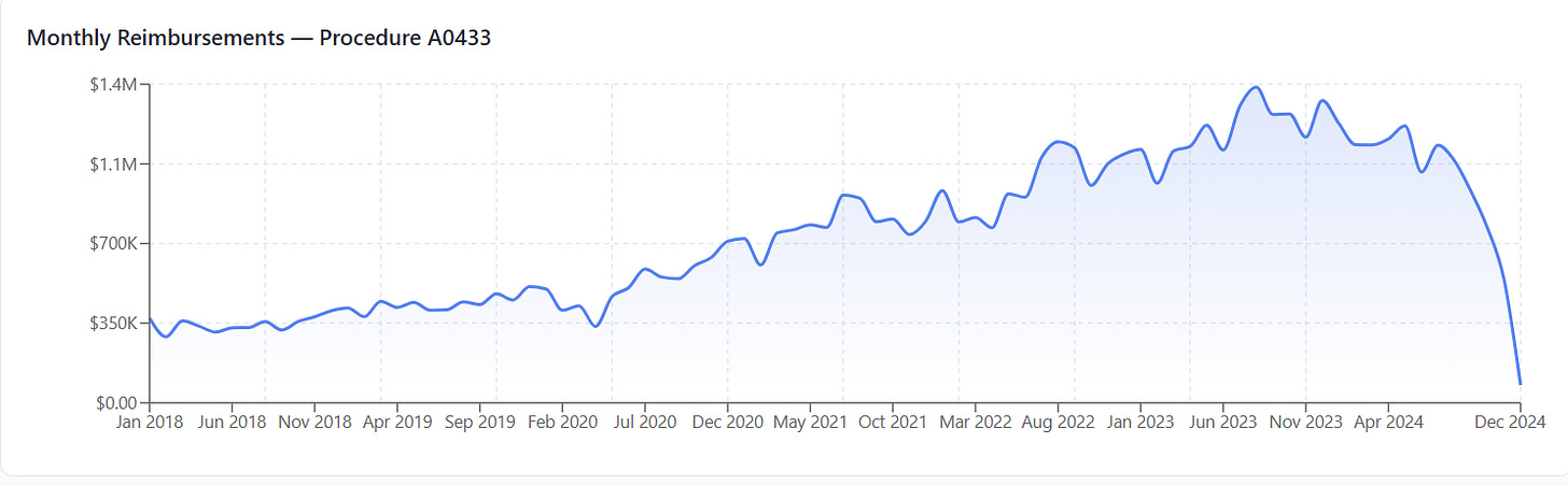 A0433 is is extreme emergency. Highest‑level paramedic care — multiple IVs, drug injection, advanced airway. These calls are up by 4X and haven’t returned to baseline. A total of 239,000 claims over the period. So something is causing this to happen